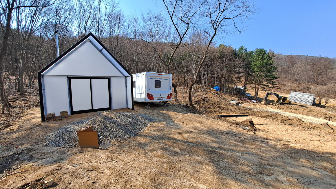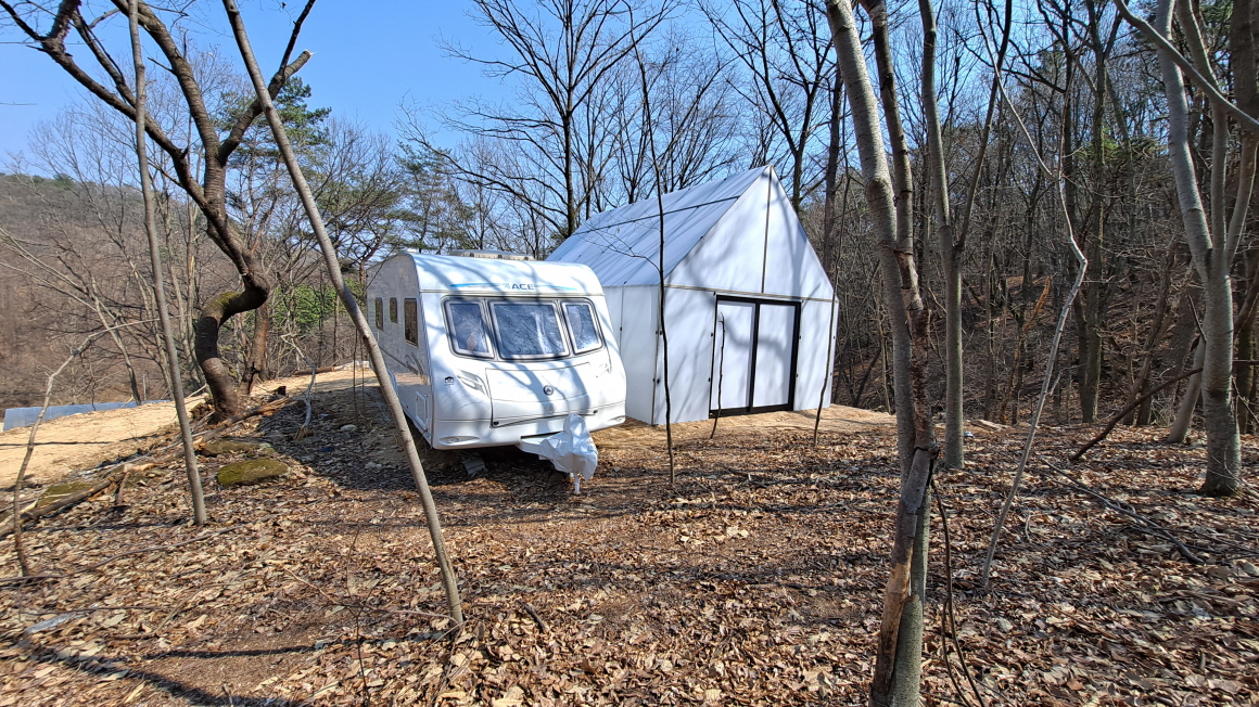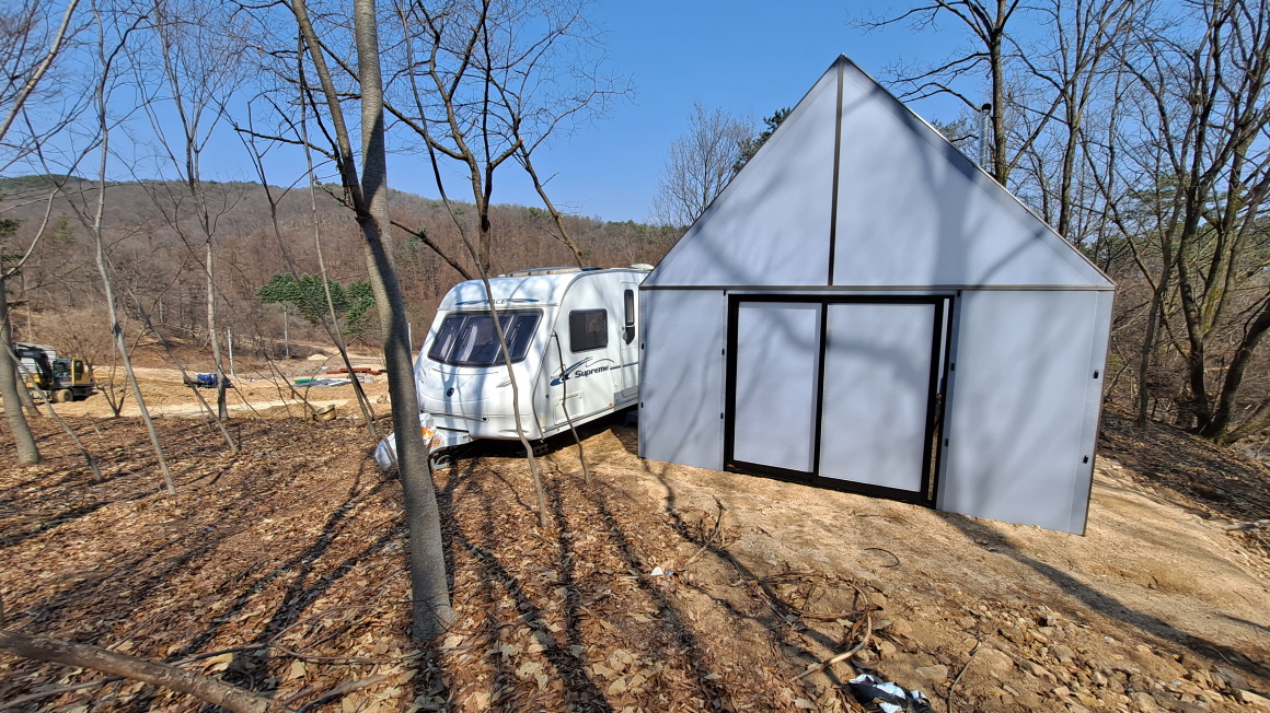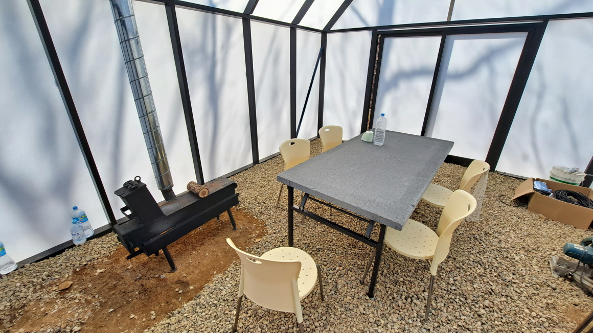 이동식 정규 카라반과 폴리카보네이트 자재의 온실과 야외 난로등을 설치하여