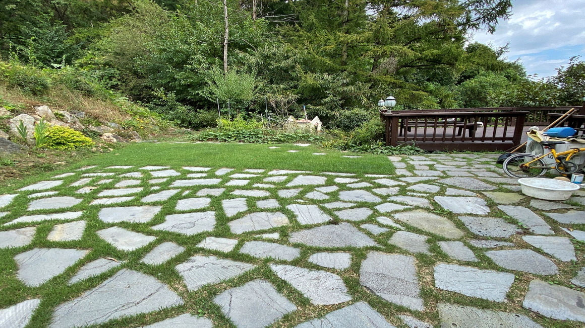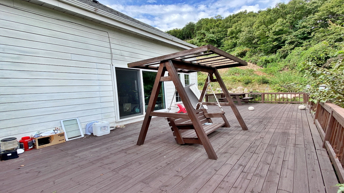 주택 오른쪽으로 데크가 설치되어 있으며 뒤쪽으로는 뒷마당이 있어