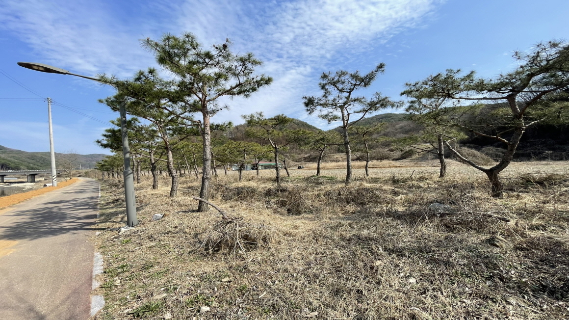 특징 남향,구거및 용두천접,소나무700그루식재,성토완료,하천및구거점용허가득
