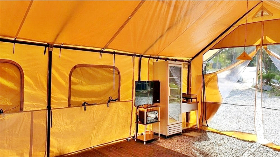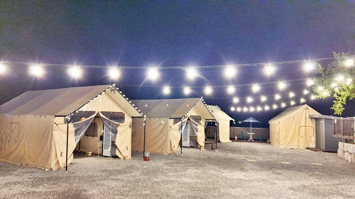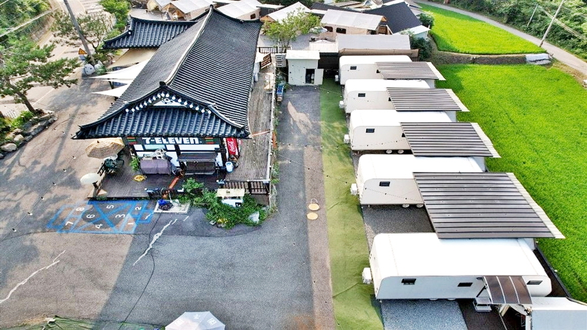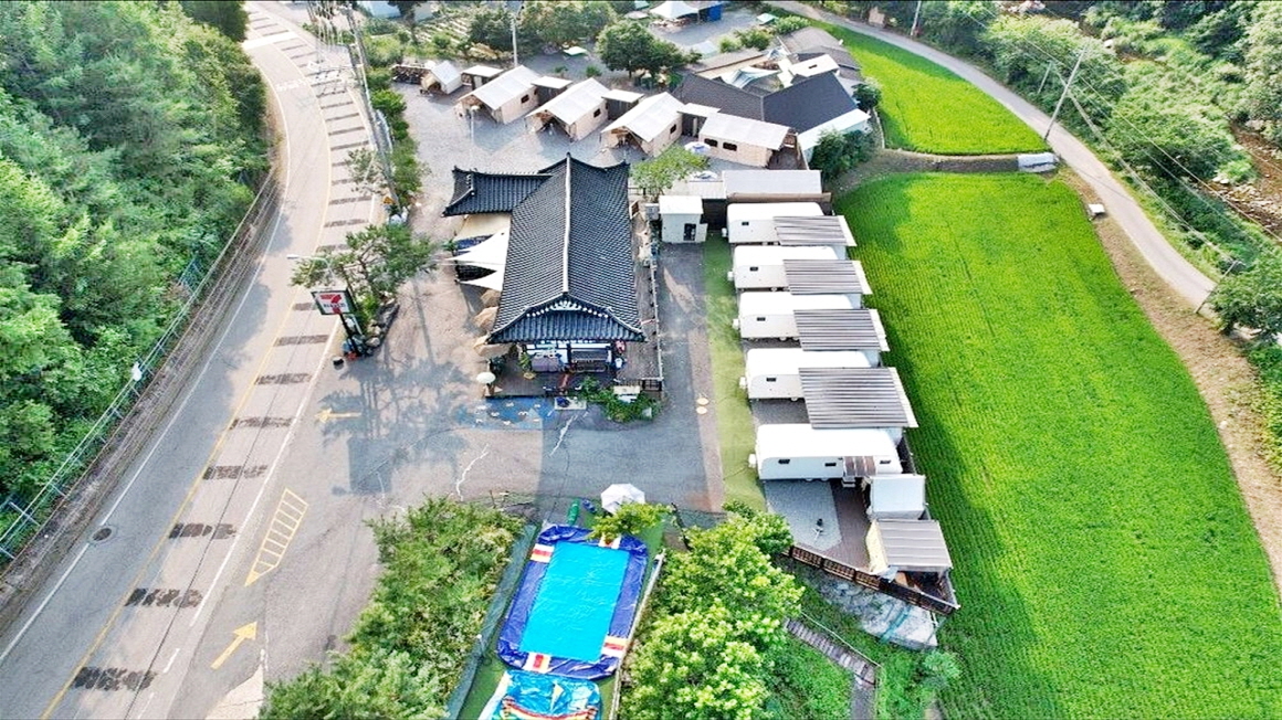 2차선 도로변의 한옥으로 건축한 단독주택과 글램핑장