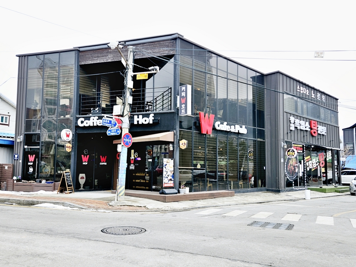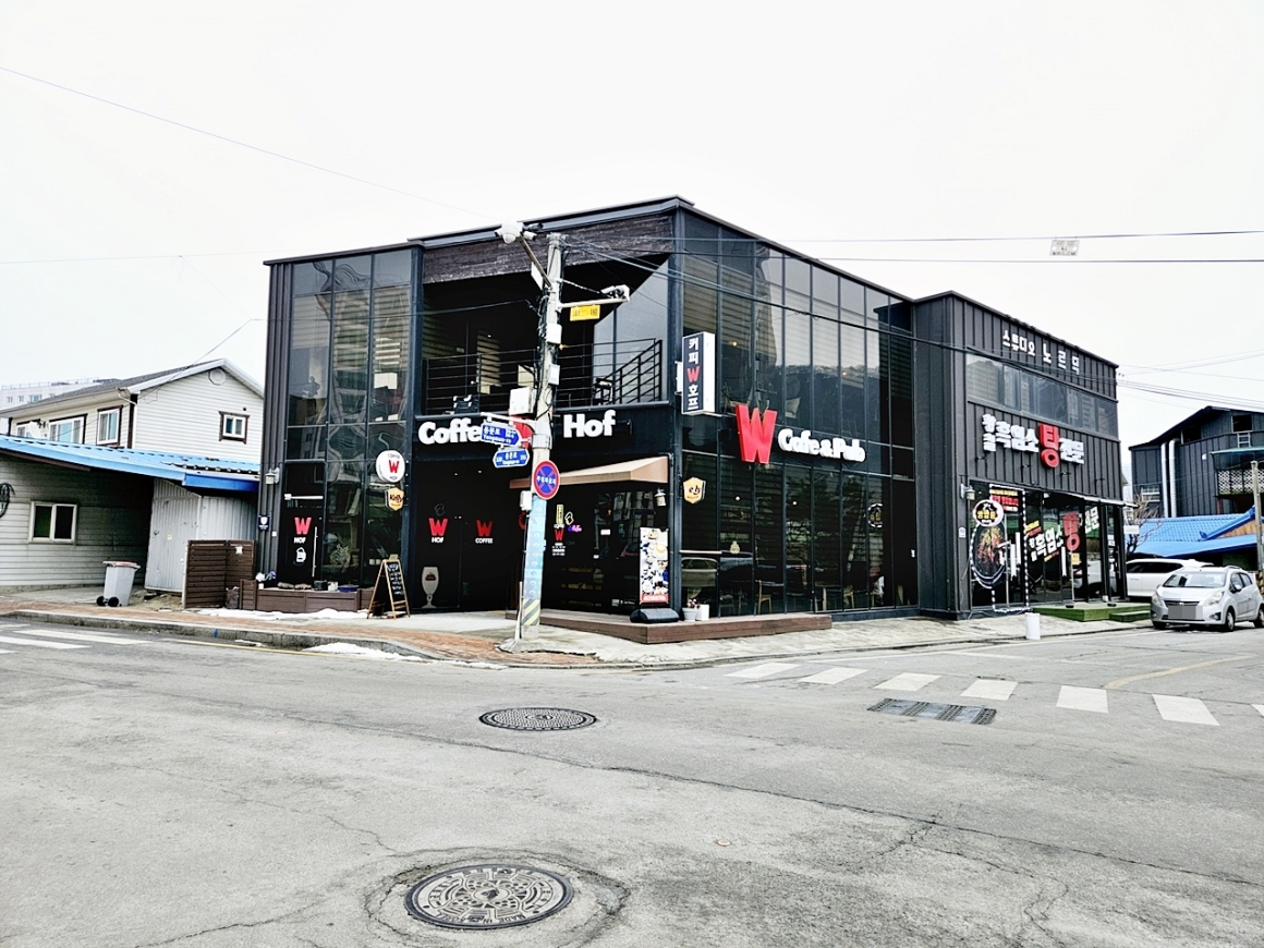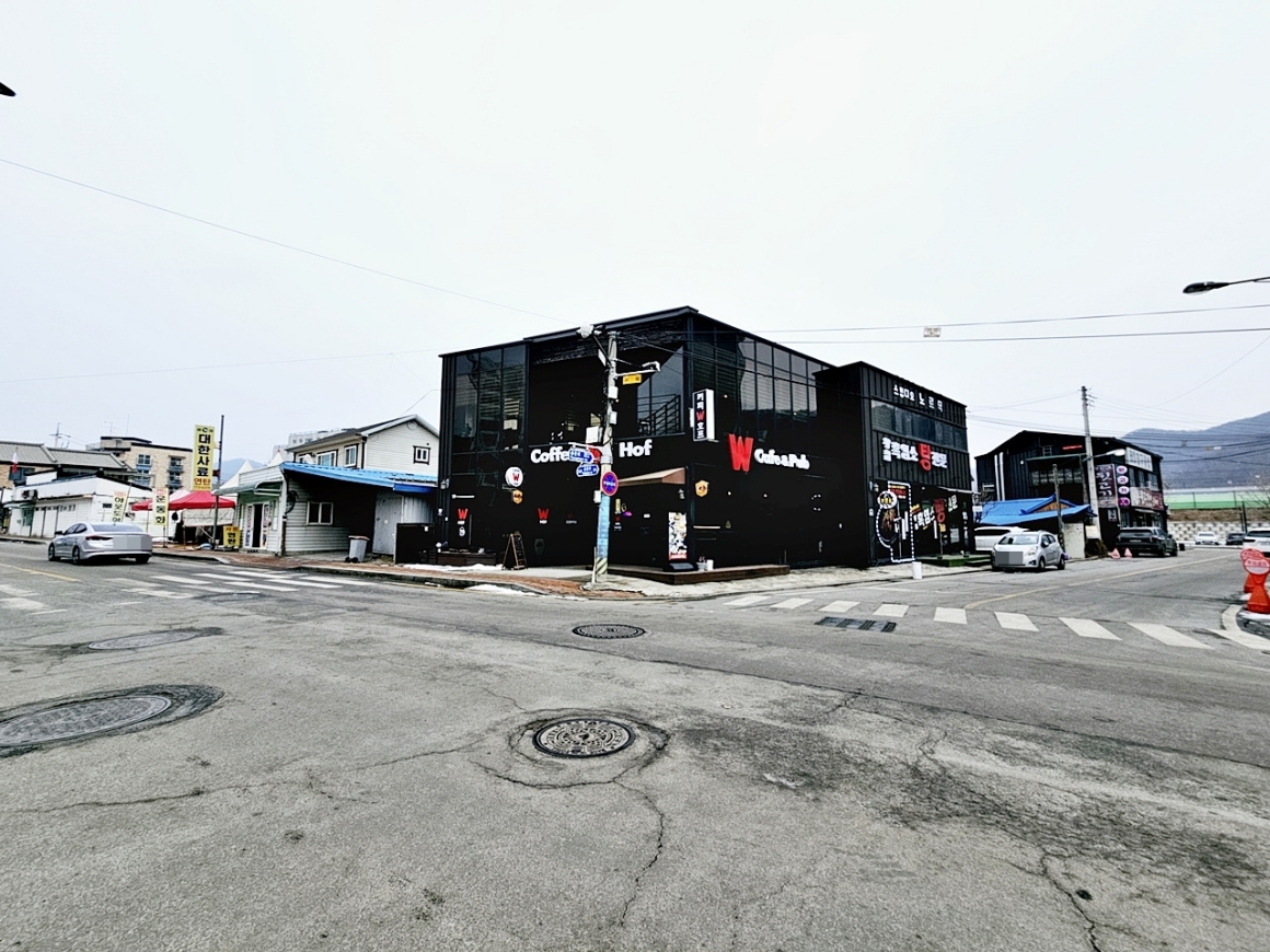앞쪽 통창 건물 25평 : 1~2층 호프집&카페 임대중 (3000/150)
