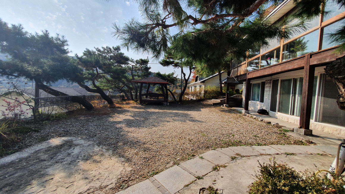 전체적으로 자갈이 깔린 마당으로 꾸며져 있으며, 야외 정자가 있습니다.