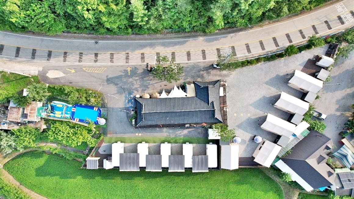 2차선 도로변의 한옥으로 건축한 단독주택과 글램핑장